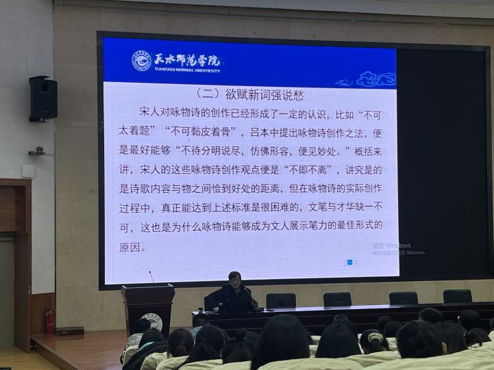 霍老师指出,“反其意而用之”在中国古代咏物诗中,是一种常见的表达现象。什么是“反”?政治上不能有“反骨”,文学创作却要有“反骨”。“反”就是逆袭,反其意而用之,懂反讽。霍老师以陆游《卜算子•咏梅》中对“梅花”的解读为例,引出毛泽东对其“反其意而用之”,突破陆游原作的思想内容,塑造了全新的梅花形象,折射出革命领袖的精神气象。后又引出了罗隐的咏物诗中“反其意而用之”现象,例举了《柳》《仙掌》《蜂》等诗中的意象加以阐释。尽管“反其意而用之”在某种程度上有利于表达诗歌的思想感情,但霍老师指出,“反其意而用之”也可能对作品的表达造成损伤,如齐梁间咏物诗“柳絮飞来片片红”已形成思维套路,导致诗意尽失,从而无意境可言。