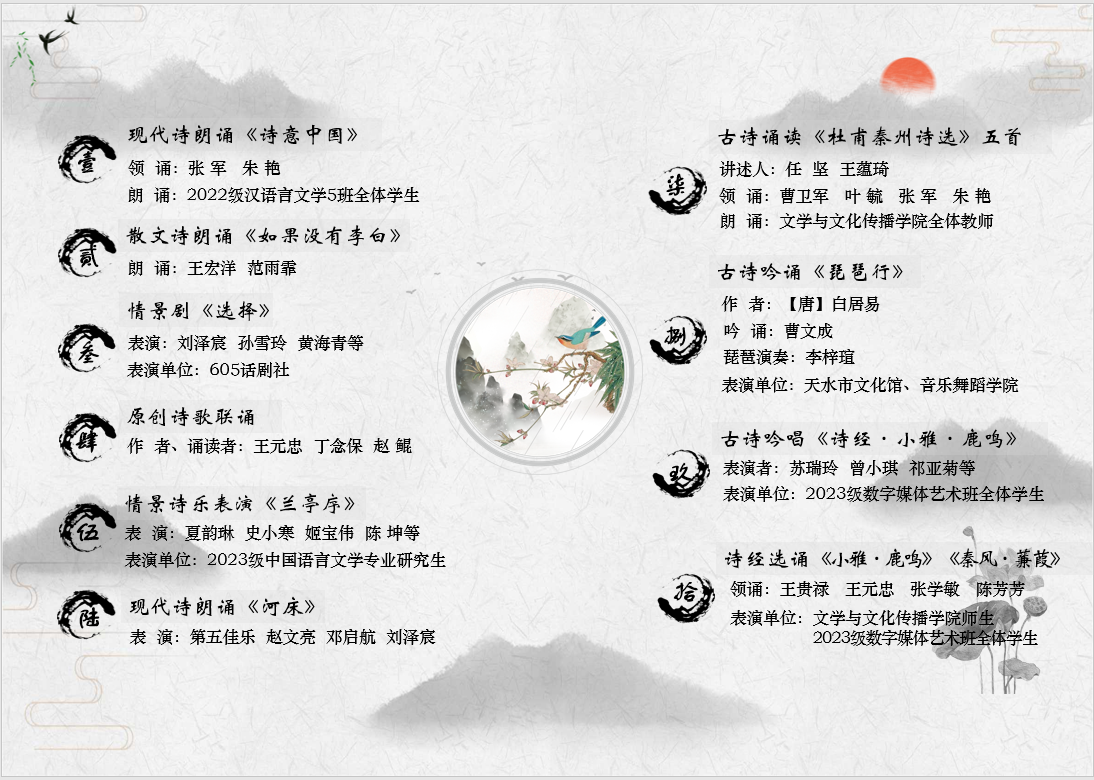 特级精品毛片免费观看师生精心排练和准备的文艺节目有:张军、朱艳带领2022级汉语言文学5班全体学生朗诵的《诗意中国》;任坚、曹卫军、叶毓、张军、朱艳、王蕴琦以及全院教职工集体诵读的杜甫秦州诗五首;王元忠、丁念保、赵鲲带来的原创诗歌联诵《下雪天组词或造句》、《双蝶记》、《致吴兴华》;学生王宏洋、范雨霏的朗诵《如果没有李白》;2023级汉语言文学专业研究生带来的情景诗乐《兰亭序》;学生赵文亮、第五佳乐等带来的现代诗朗诵《河床》;2023级数字媒体艺术一班带来的诗词吟唱《诗经·小雅·鹿鸣》;王贵禄、王元忠、张学敏、陈芳芳带领全场师生诵读的《鹿鸣》、《蒹葭》等。