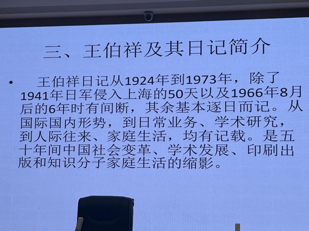 张教授阐述了王伯祥日记的特使史料价值,如记载重要人物事件、详尽记载某些特殊事件的过程、无意留存的其他资料等,并以当下的学术前沿实例,来证明王伯祥日记在当今的重要学术价值。
