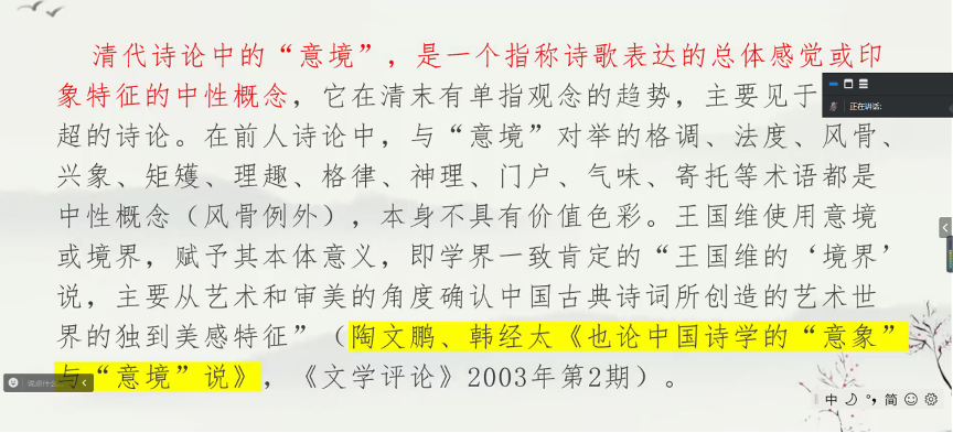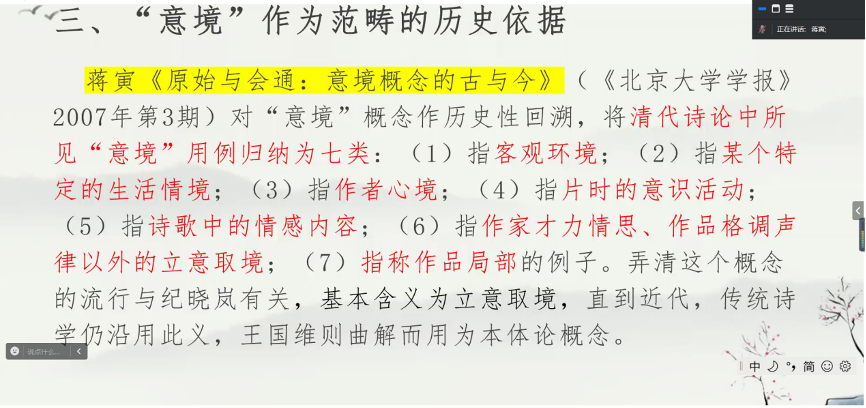 蒋寅教授在讲座开始指出,我们的辞典和教科书对“意境”的本质缺乏清晰的界定,定义不清楚。参看近代以来学者对意境的定义,如宗白华、夏昭炎、顾祖钊等,大多存在观念、术语、概念、范畴的混淆。通过以上分析,蒋寅教授总结出,对意境的不同理解实质上源于对理论定位的不同判断。如此复杂的问题无法纳入一个概念中,因此解决问题的方式,不在于如何扩充意境的内涵和定义,而在于赋予它更适当的理论定位。历来意境的阐释根本缺陷在于我们谈论的是一个范畴的问题,却当它概念来对待,缺乏清晰的理论定位。