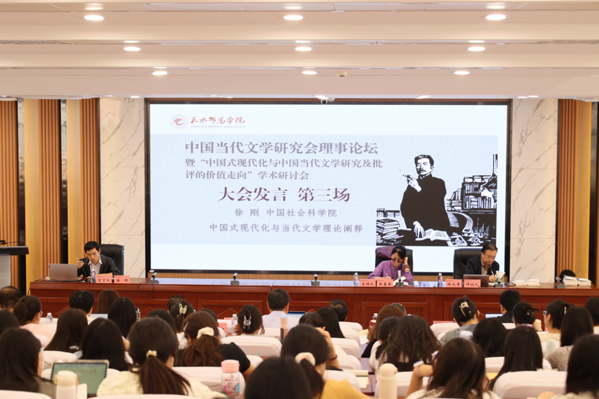 2024年9月14日下午2:30,中国当代文学研究会理事论坛暨“中国式现代化与中国当代文学研究及批评的价值走向”学术研讨会在天水师范学院召开,大会第三场发言在第一报告厅举行,徐刚、王贵禄、李蔚超、曾攀围绕中国式现代化主题做了报告。会议由韩春燕教授主持,徐兆寿教授作评议。
