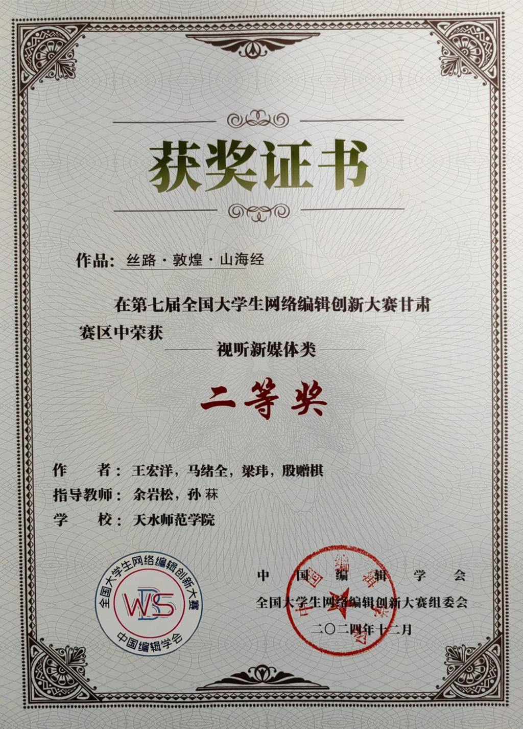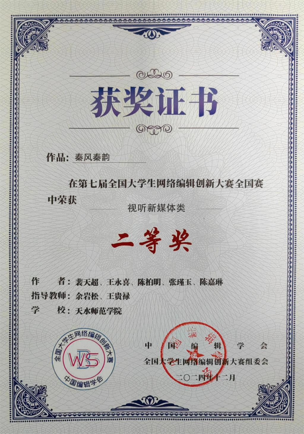 在特级精品毛片免费观看王贵禄教授及余岩松、许峰铭、程琦、孙菻等教师的指导下,2021级戏剧影视文学专业及网络与新媒体专业裴天超、王永喜、陈柏明等同学,跨专业联合拍摄的纪录片《秦风秦韵》,获得第七届全国大学生网络编辑创新大赛全国赛“视听媒体类”二等奖;2021级戏剧影视文学专业何洁、晏荣等同学拍摄的纪录片《陶·禧》;2022级网络与新媒体专业王宏洋、马绪全等同学创作的创意短视频《丝路·敦煌·山海经》获得甘肃赛区“视听媒体”类二等奖,2021级戏剧影视文学专业张带霞、陈婷婷等拍摄的纪录片《焰舞长空,古今共鸣》荣获三等奖。