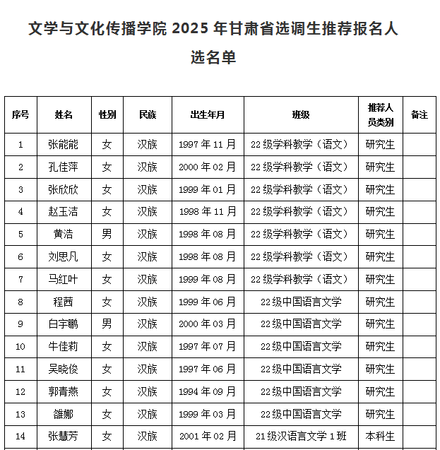 根据学校文件要求,经学生个人申请、各班民主推荐,学院党政联席会议审定,拟推荐2022级学科教学(语文)张能能、孔佳萍等13名研究生,21级汉语言文学1班张慧芳、王艳等34名本科生为学院2025年甘肃省选调生报名人选,现予以公示(人选名单详见附件)。