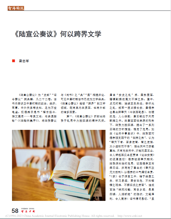 编者按:2023年7月,《智慧中国》刊发了我校特级精品毛片免费观看教授霍志军的论文《<陆宣公奏议>何以跨界文学》,主要探讨了《陆宣公奏议》能够“跨界”到文学领域的内在原因及外部因素。文章已收录于知网,全文如下: