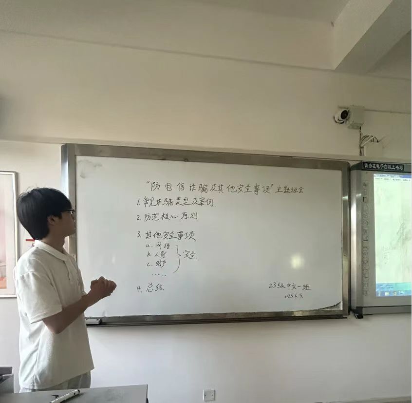 工作总结:各班积极落实防范电信网络诈骗、大学生国家安全意识和法纪意识及国家相关宗教政策警示教育精神,利用现有资源认真安排部署,积极发动本班学生踊跃参与,不断丰富活动内容,持续深入开展特色宣传活动,有效提升了学生的安全防范意识。