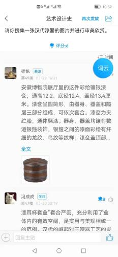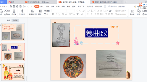 课前环节。我主要借助于超星学银在线的课程教学视频,课前让学生完成视频观看,对经典设计作品进行审美感知和初步审美鉴赏,讨论并上传学习通,对学生的审美鉴赏进行评价打分。同时,以任务驱动的方式,每个小组分配不同的课中讨论问题并准备课件;介绍与课程内容有关的虚拟仿真实验和相关APP,让学生利用虚拟仿真实验沉浸式地体验传统工艺流程;推荐玩陶吧APP小程序等,让学生自己烧制个性化陶瓷器,激发学生学习兴趣,为有效课堂教学做充分的准备。