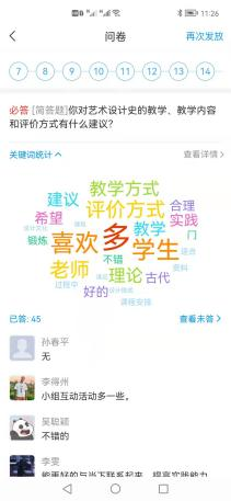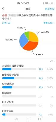 课堂教学。课中运用超星学习通+腾讯会议直播的方式,设计丰富的课堂活动,激发学生的热情。如用抢答和选人,让学生能紧跟教师讲解的思路进行思考并讨论,教师及时给予评价和激励,增强学生的自信心;讲解过程中层层追问,诱导学生探索解决问题;在展示交流环节,每个小组的发言学生通过投屏或屏幕共享的方式积极踊跃展示,小组之间对刚才的展示互评打分,教师激励评价;同时,教学中注重课程思政润物细无声的融入,以美育逐渐浸润学生的心田,达到真善美的价值引领。最后通过课堂测试和问卷调查,一方面对学生的学习效果进行检测,另一方面教师也及时了解课程教学中存在的问题与不足,通过反思不断改进和提升教学。