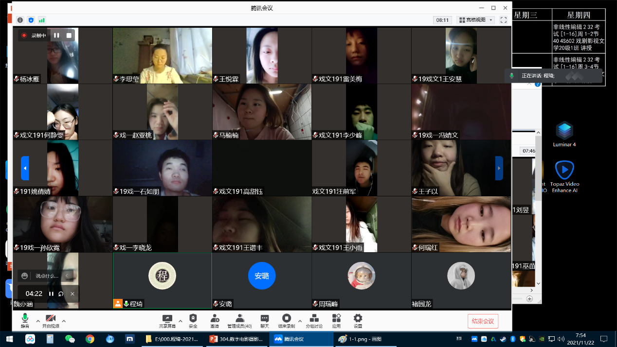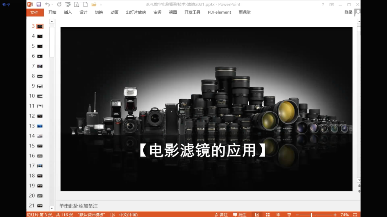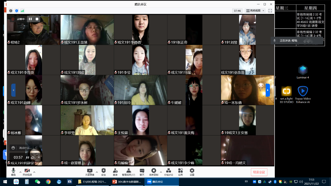 课堂中,先就电影滤镜分类进行了说明,详细讲述了柔化系列效果滤镜、光学系列滤镜、颜色系列滤镜、灰度、偏振镜系列滤镜、降对比系列滤镜等几种电影摄影中常用的滤镜的作用与区别;接着针对ND、GND、IR-ND、PL镜的具体功能、特性及应用技巧进行讲解;然后重点讲述了滤镜系统在电影摄影中的应用,利用摄像头,给学生进行了遮光斗的实物展示。并将2021年秋季最新发布的“铁头-幻镜K1”系列遮光斗滤镜系统进行了介绍和视频展示,把最新的前沿动态带给学生。最后进行了归纳总结。在授课的同时,注重贯穿对课程思政目标的落实,因势利导,引导学生在蜗居宿舍防疫的过程中,安抚学生,鼓励学生在逆境中学会自洽、自处,共克时艰。
