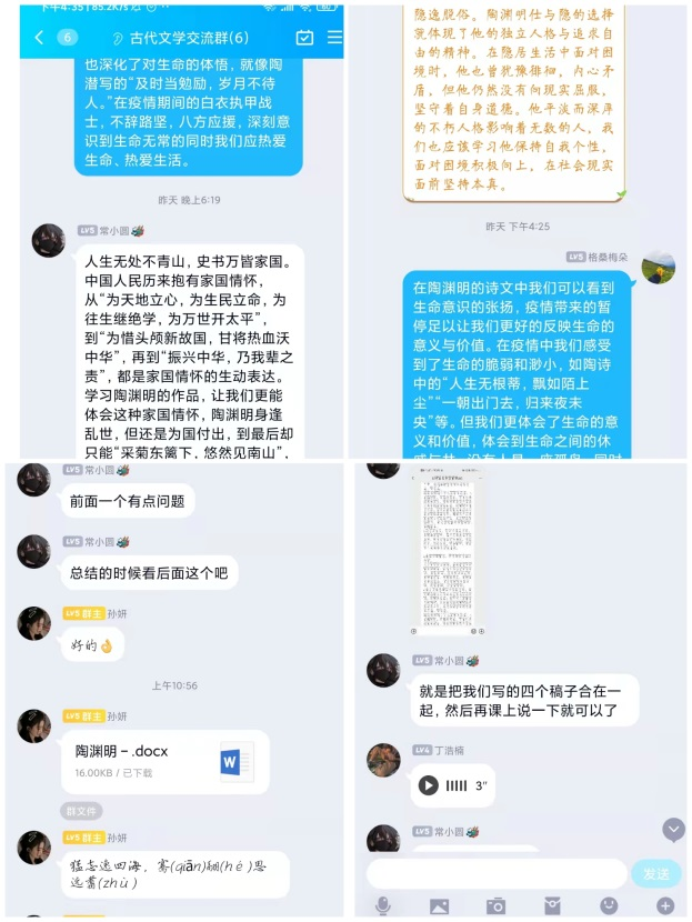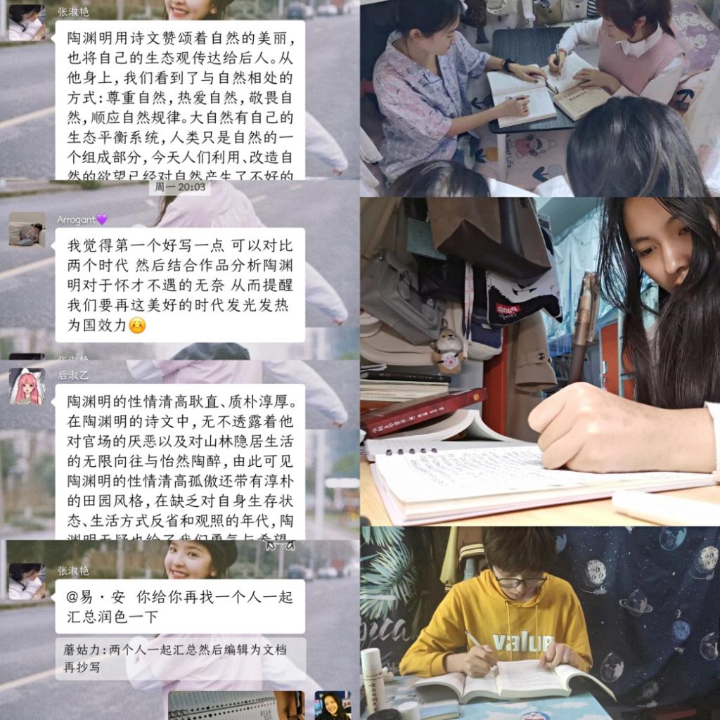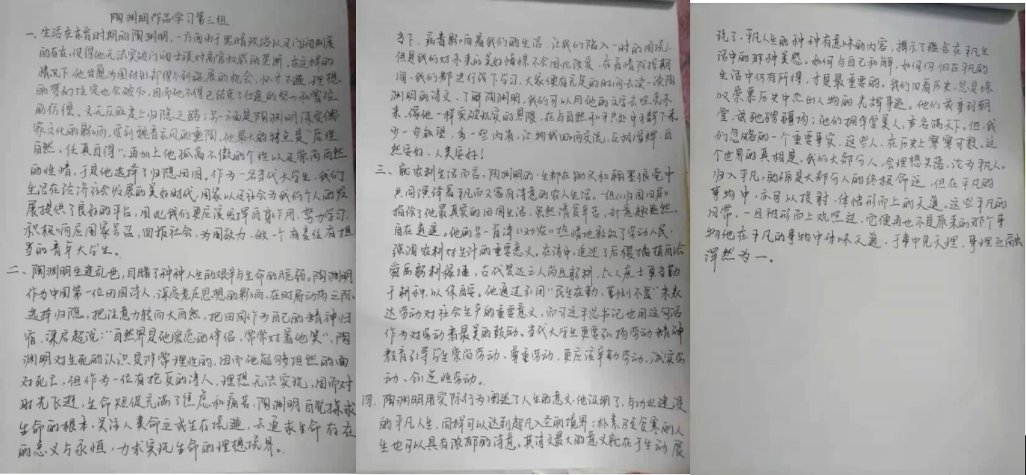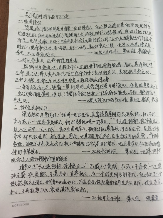 全班按照电脑随机分为九组,每组六人。讨论主题:陶渊明的当代价值及文化意义(须围绕课程思政的设计要点进行讨论)。