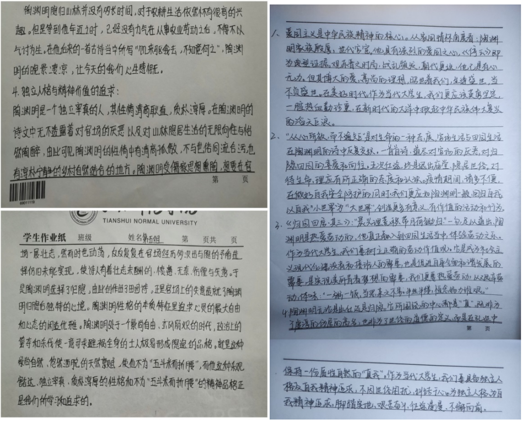 (一)古典文学蕴含丰富的育人效果。通过对陶渊明的讲解较好地发挥了文学经典润物无声的教育功能,培养了学生的家国情怀,激发了他们对劳动的热爱,重新认识生命的价值与意义。