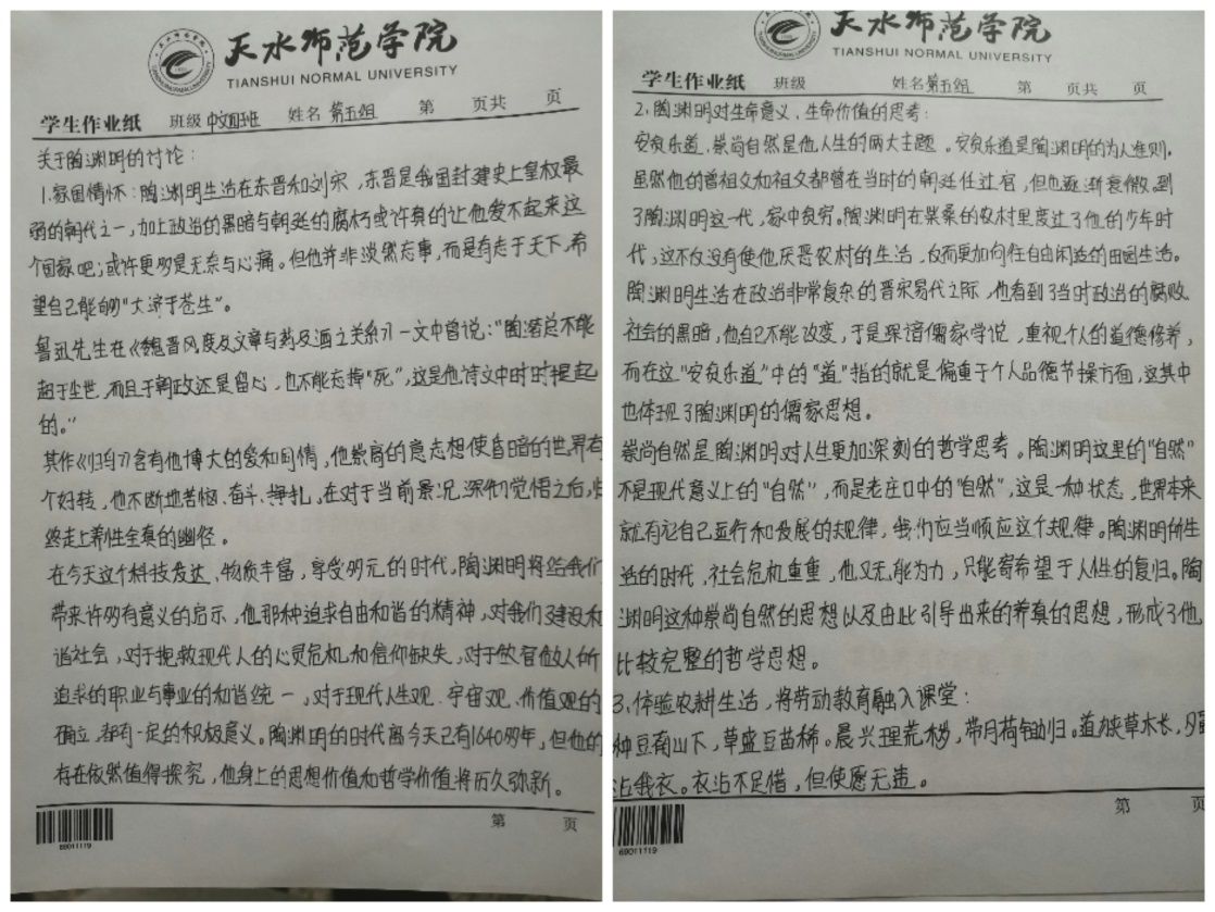 在讲课之前已经布置学生阅读袁行霈的《陶渊明集笺注》,学生以小组为单位,阐述对陶渊明的认识以及陶渊明的当代意义。